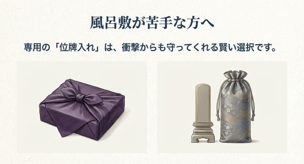 現代では、「風呂敷の包み方がどうしても覚えられない」「電車移動なので、風呂敷包みだと目立ってしまって気まずい」という方も少なくありません。そのような場合は、無理に風呂敷にこだわらず、市販されている「位牌入れ(位牌袋)」を活用するのが賢明な選択です。