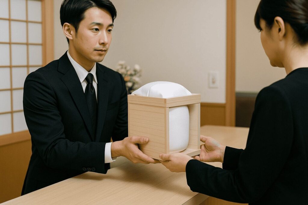 受け渡し後は一拍おいてから骨壺に納め、衝撃音を立てない配慮が場の緊張を和らげます。